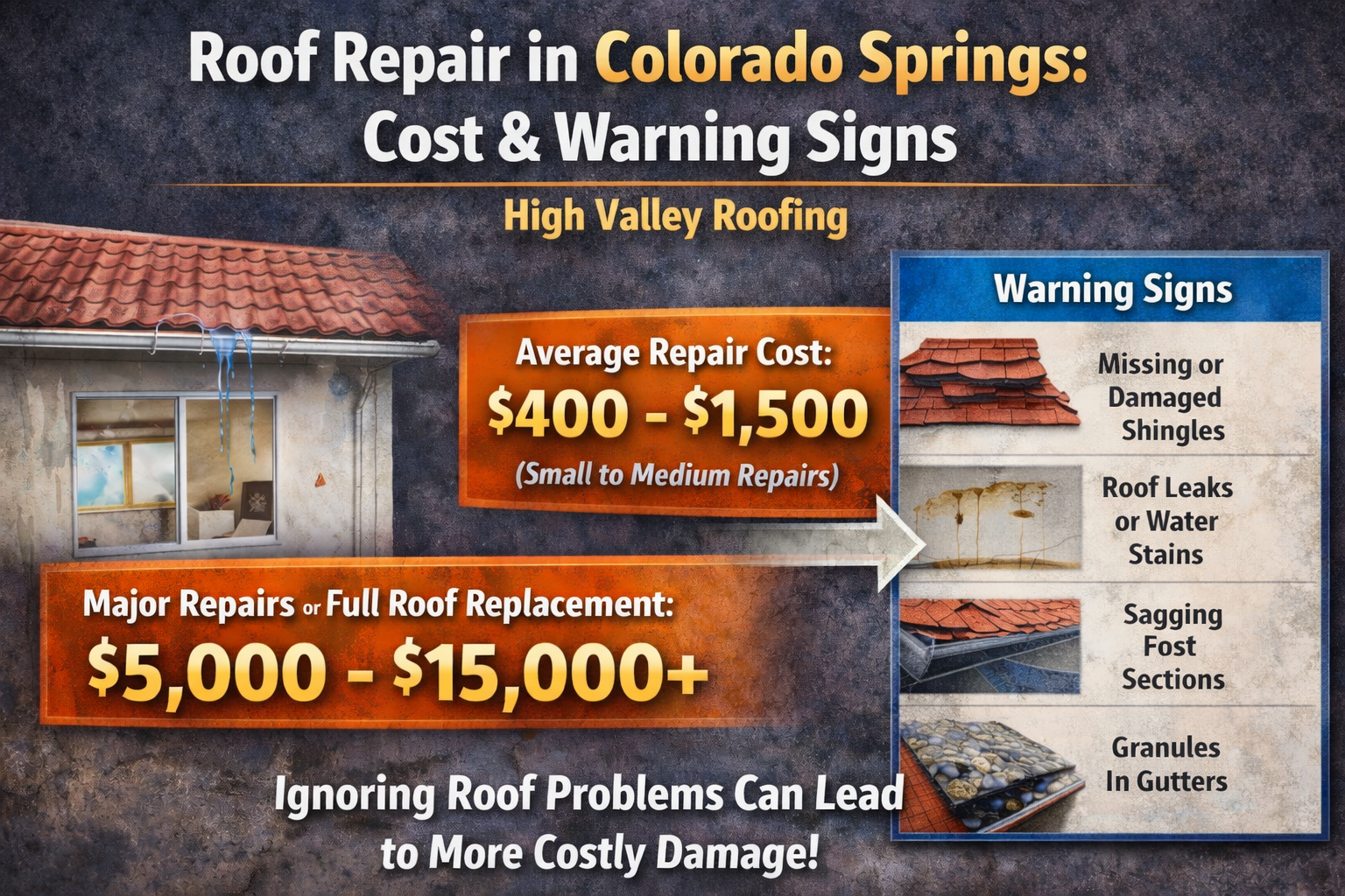 Roof repair costs in Colorado Springs typically range from $300 to $1,500, depending on the extent of the damage. Minor repairs like replacing a few shingles are relatively inexpensive, while more extensive repairs can be costly.